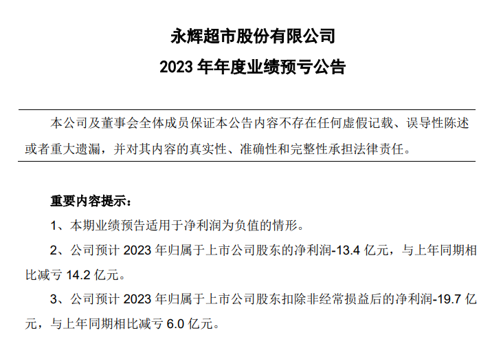 对此。永辉在业绩预告中表示,报告期内公司管理层持续推进门店优化调整,关闭了部分长期亏损门店;同时,公司推进供应链数字化,商品结构调优,供应商分级管理等供应链端的各项变革,通过不断优化内部管理流程、推行新型考核制度等措施激发员工活力实现降本增效。在此基础上,永辉预计2023年净利润与上年同期相比减亏14.2亿元,扣非净利润亏损19.7 亿元,与上年同期相比减亏6亿元。