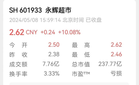 5月8日,永辉超市(601933.SH)股价涨停。截至当日上午收盘,永辉超市市值238亿元,与盘前216亿元相比增加22亿元。
