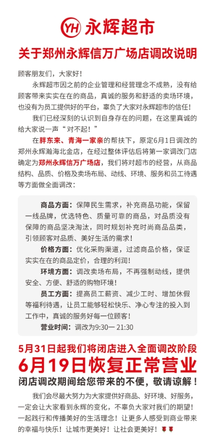 5月27日,胖东来帮扶调改永辉超市由郑州瀚海北金店变更为郑州信万广场店。信万广场店将于5月31日闭店改造,6月19日恢复营业。