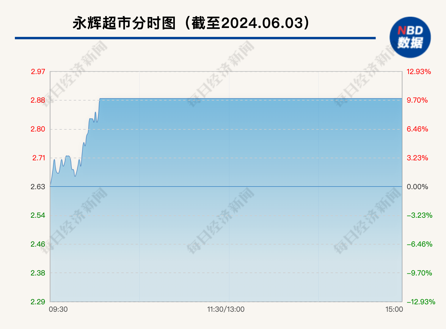 盘面上,截至今日收盘,永辉超市涨停,股价2.89元,市值262.27亿元。