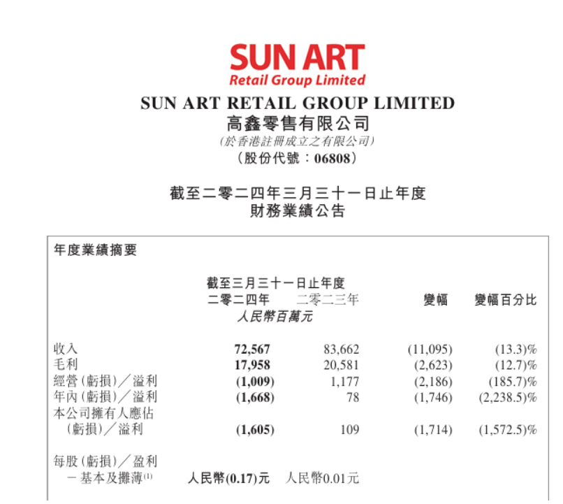 大润发的母公司高鑫零售,2023年4月1日至今年3月31日,实现营业收入725.67亿元,同比下滑13.3%;归属母公司股东综合收益亏损16.05亿元,是上市以来亏损最严重的一次。