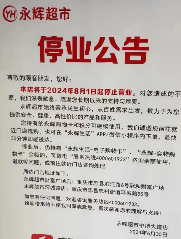 最近,永辉超市永川学府大道店已经停业,宝圣西路店将于7月27日停业;人和街店将于7月31日停业;中博大道店将于8月1日起停业;还有大学城的千佰汇店、巫山店等,也都将在最近停业……