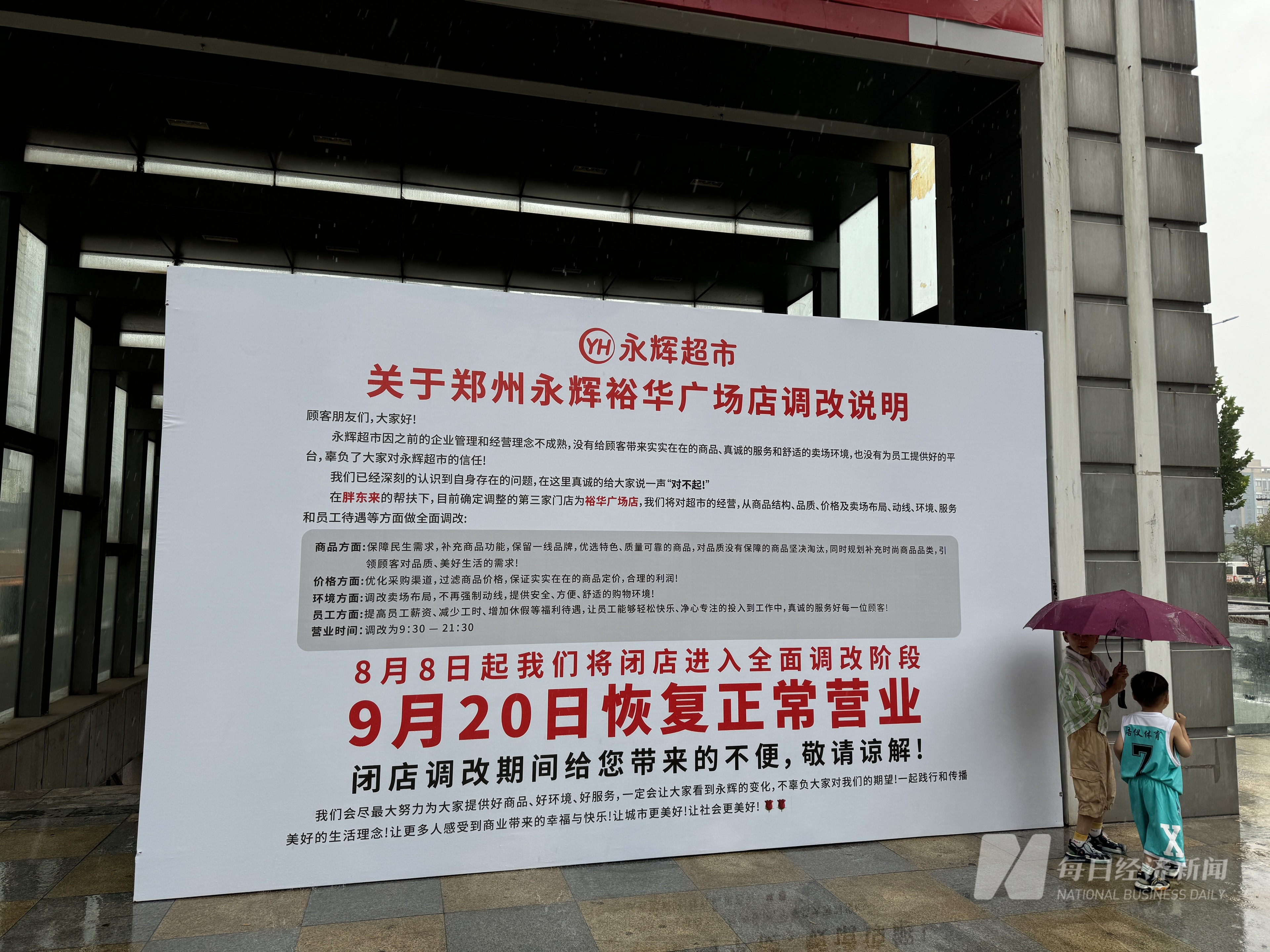 今日(8月8日),《每日经济新闻》记者在永辉超市郑州裕华广场店门口处看到了一则调改说明,上述说明称,“在胖东来的帮扶下,目前确定调整的第三家门店为裕华广场店。”超市8月8日起将闭店,9月20日恢复正常营业。在裕华广场内,记者看到永辉超市正在大厅进行招聘,需要生鲜经理、食用经理、面包师/厨师等。