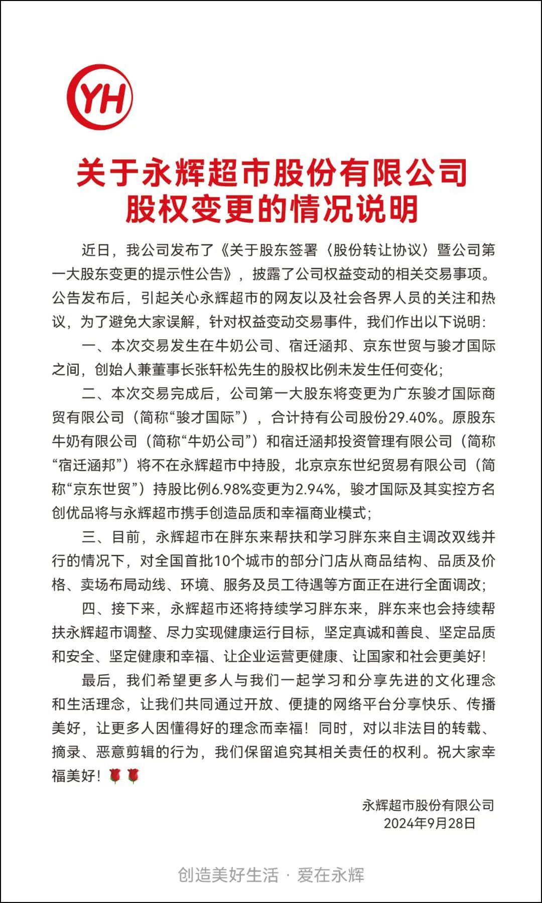 针对市场上流传的“董事长跑路”、“背刺胖东来”等不实传闻,永辉超市通过其官方微信公众号于9月28日晚间发布正式声明,就近期股权变更事宜进行了详细澄清与说明。