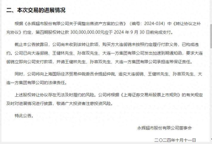 永辉超市出售资产一事再次受到市场关注。10月10日晚,永辉超市发布了一则关于出售资产的进展公告。公告指出,根据公司与大连御锦签订的《转让协议之补充协议》约定,第四期股权转让款3亿元应于2024年9月30日前完成支付。截至公告披露日,公司尚未收到该转让款项,购买方大连御锦未按照约定履行付款义务,已构成违约。
