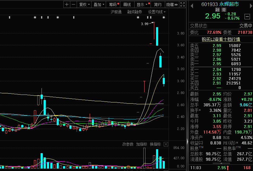 截至发稿,永辉超市报跌8.67%,报2.95元每股。