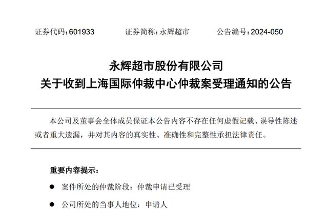 据永辉超市最新公告,10月12日,公司收到上海国际经济贸易仲裁委员会(以下简称“上国仲”)受理通知。上国仲收到公司提交的永辉超市与大连御锦贸易有限公司(下称“大连御锦”)、王健林、孙喜双、大连一方集团有限公司(下称“一方集团”)关于《股份转让协议》及《补充协议》仲裁案件的仲裁申请书及附件,于当日决定受理。目前尚未开庭审理。