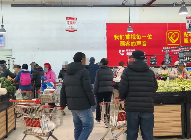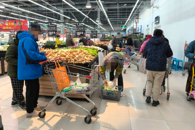 超市的果蔬区聚集了许多中老年顾客,他们精心挑选着新鲜的蔬菜,称重区也排起了长队。