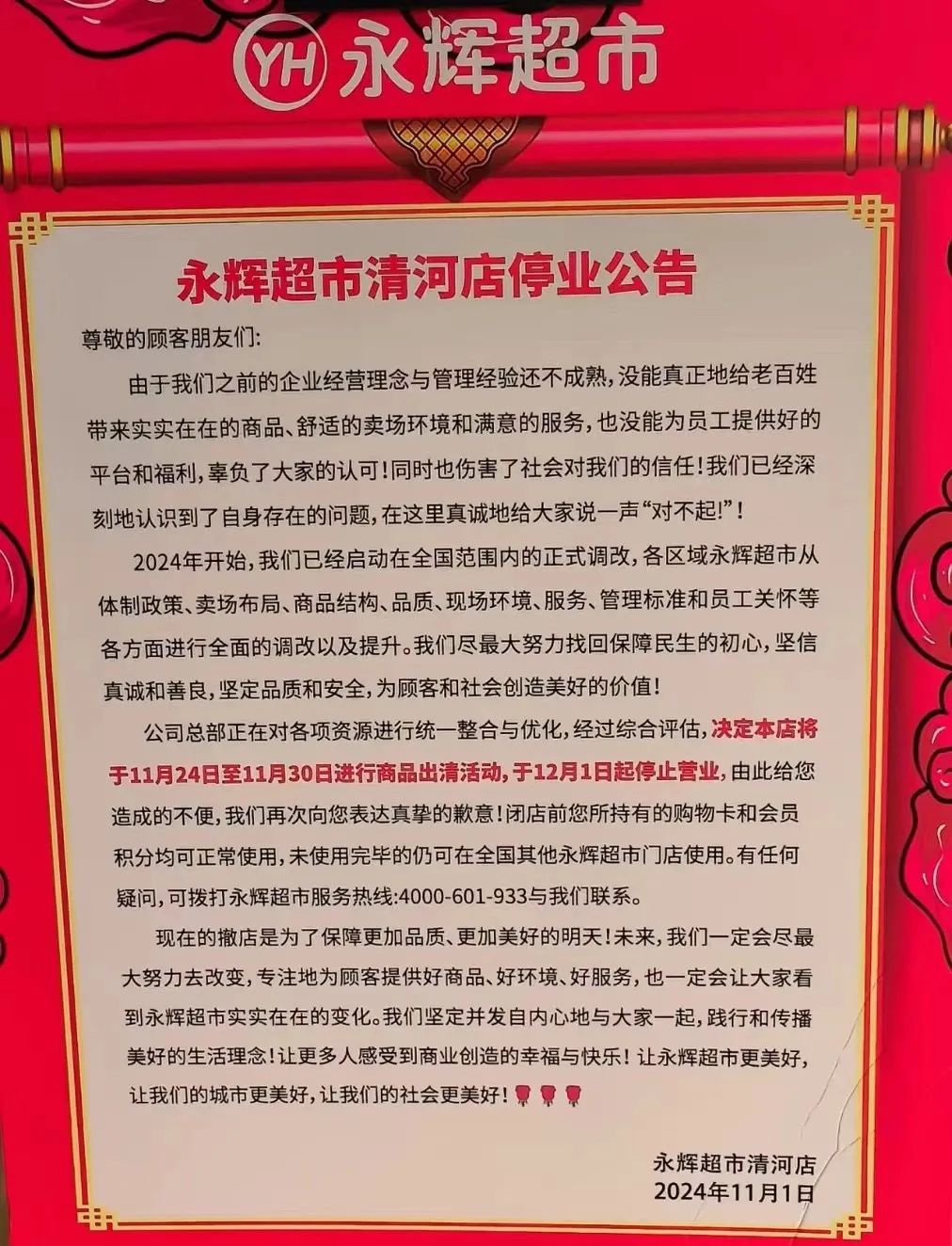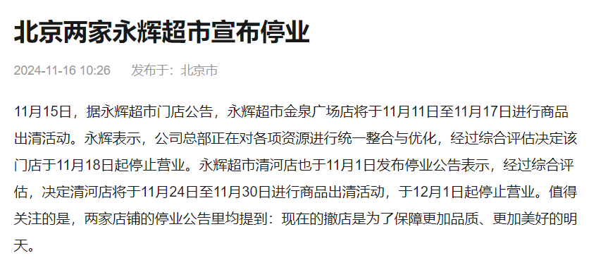 近日,北京两家永辉超市:永辉超市金泉广场店和永辉超市清河店,先后宣布关闭,闭店原因是“公司总部正在对各项资源进行统一整合与优化,经过评估后闭店。”
