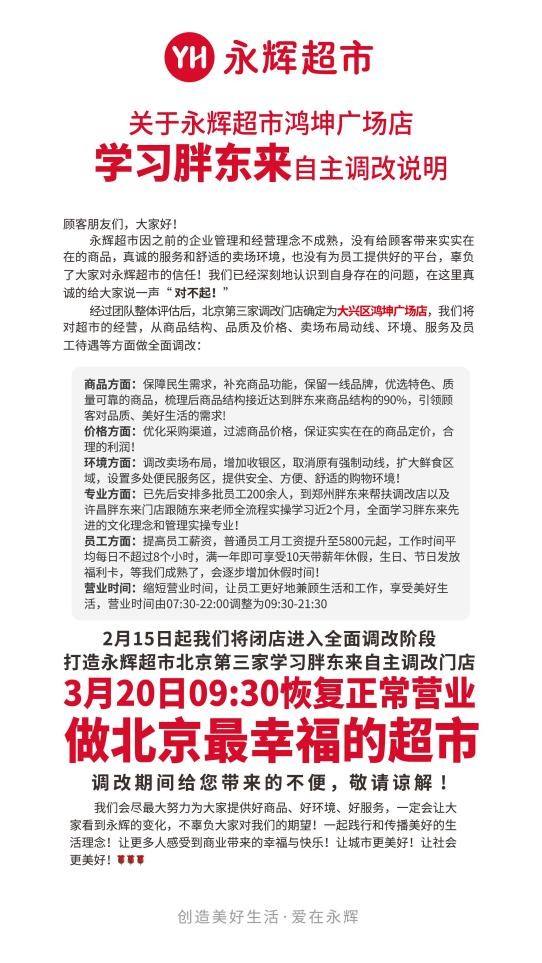 2月12日,新京报记者从永辉超市方面获悉,位于北京市大兴区鸿坤广场的永辉超市将于2月15日正式进入闭店调改阶段,计划于3月20日恢复正常营业。据了解,这是北京永辉超市继石景山区喜隆多店和房山区印象城店之后自主调改的第三家门店。