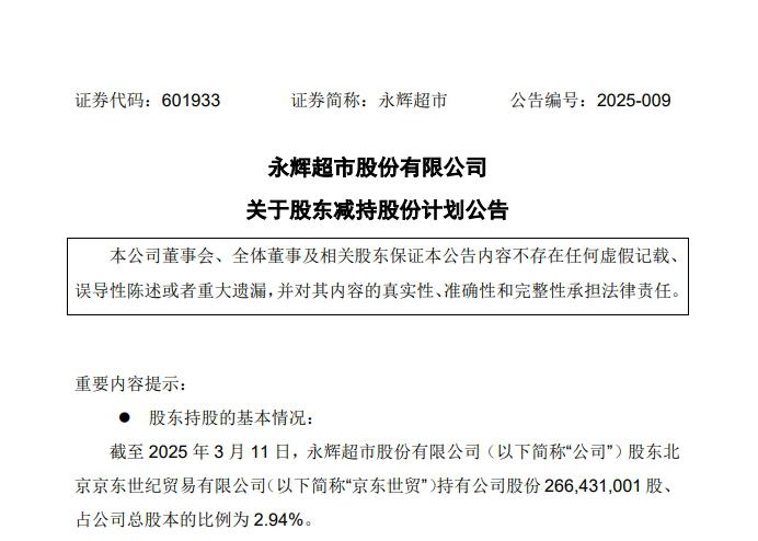 公告内容显示,截至 2025 年 3 月 11 日,京东世贸持有永辉超市股份 2.66 亿股、占总股本的比例为 2.94%。此次京东世贸拟通过集中竞价交易方式减持不超过 9075 万股,通过大宗交易方式减持不超过 1.76 亿股。减持期间为本减持计划预披露公告发布之日起 15 个交易日后的 3 个月内。