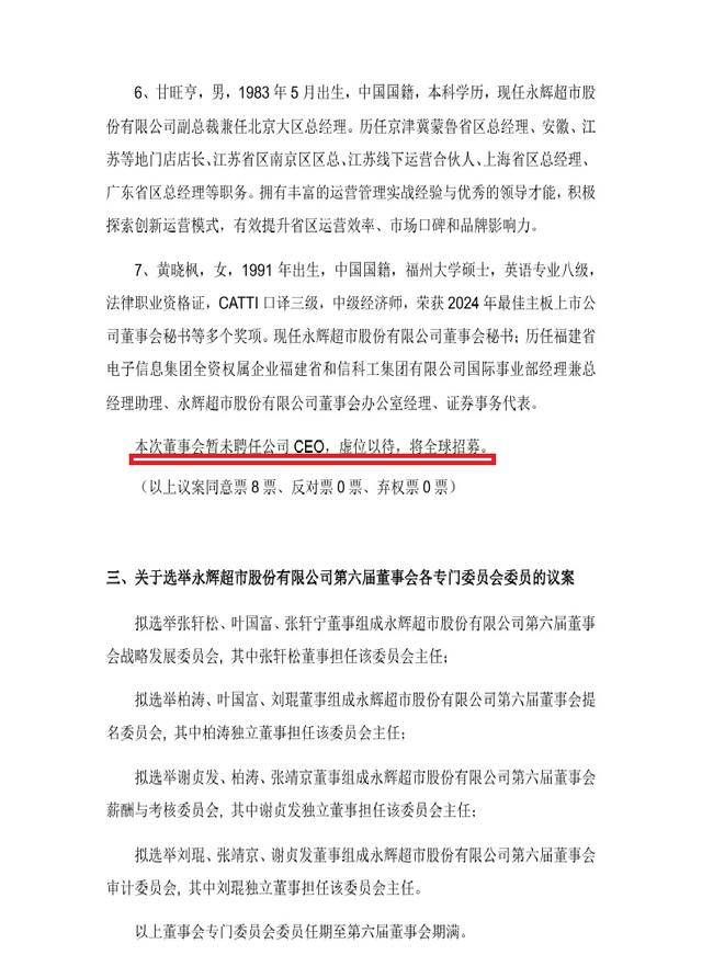 与此同时,新一届董事会已提名多位高管人选,但李松峰的名字并未出现在其中。这一变动无疑给永辉超市的未来带来了新的不确定性。公告还明确指出,目前董事会尚未决定聘任新的CEO,这一职位将暂时空缺,公司计划在全球范围内进行招募。