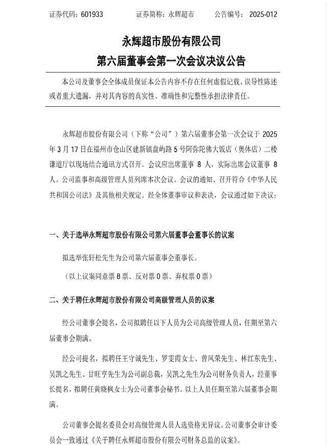 近期,永辉超市发布了关于2025年第一次临时股东大会及第六届董事会第一次会议的公告,其中透露出公司高层的重要变动。公告显示,永辉超市原董事、CEO李松峰在选举中因得票未达标准,遗憾未能入选第六届董事会非独立董事名单。