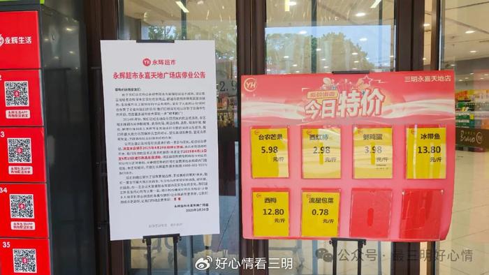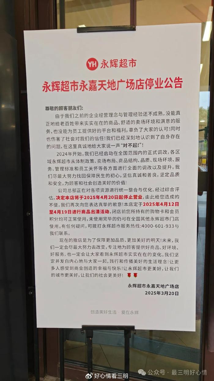 近日,永辉超市永嘉天地广场店突发公告,将于4月20日停业!