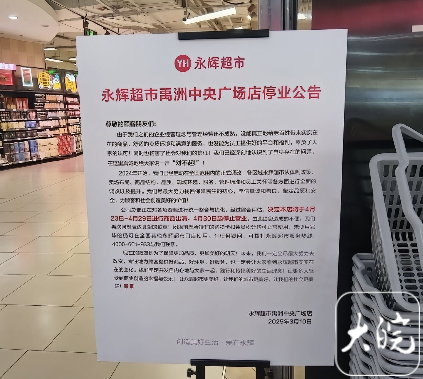 根据永辉超市张贴的公告显示,禹洲中央广场店将于4月23日-4月29日进行商品出清,4月30日起停止营业;奥园城市天地店将于4月18日-4月24日进行商品出清,4月25日起停止营业。