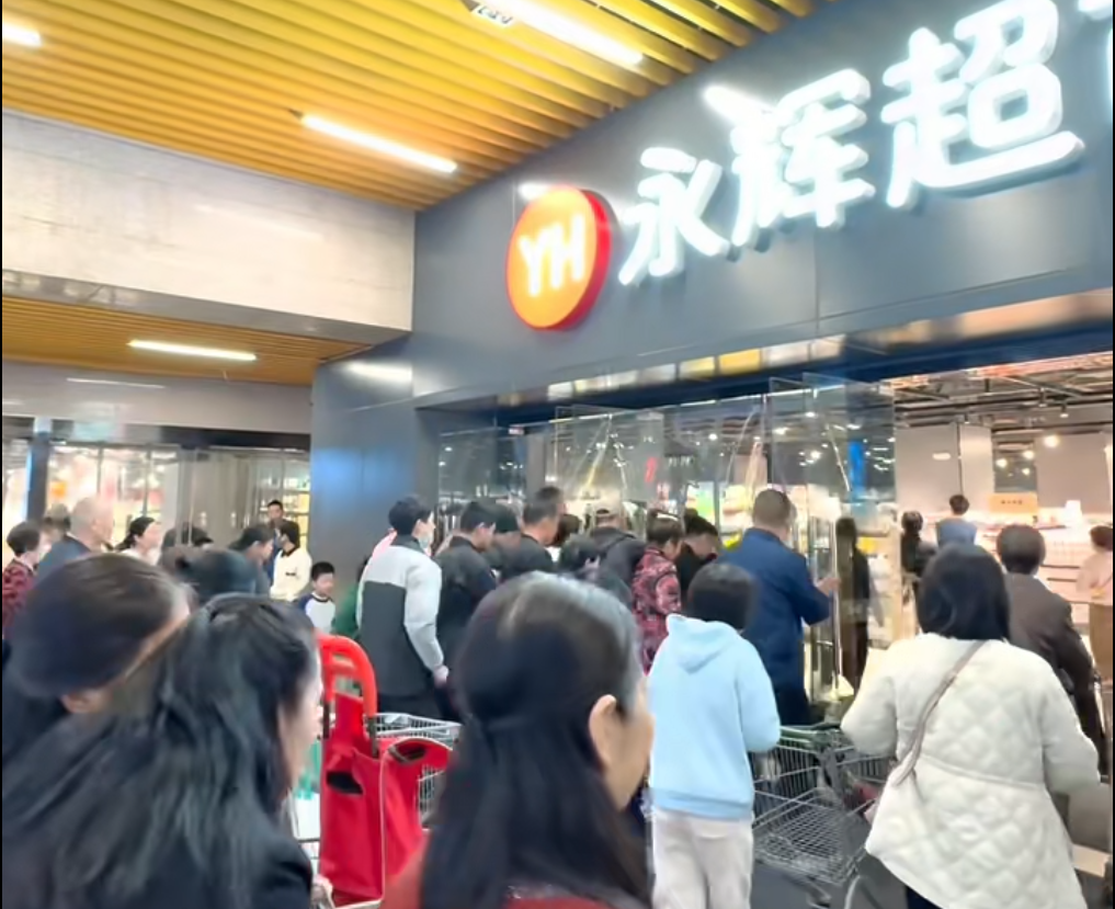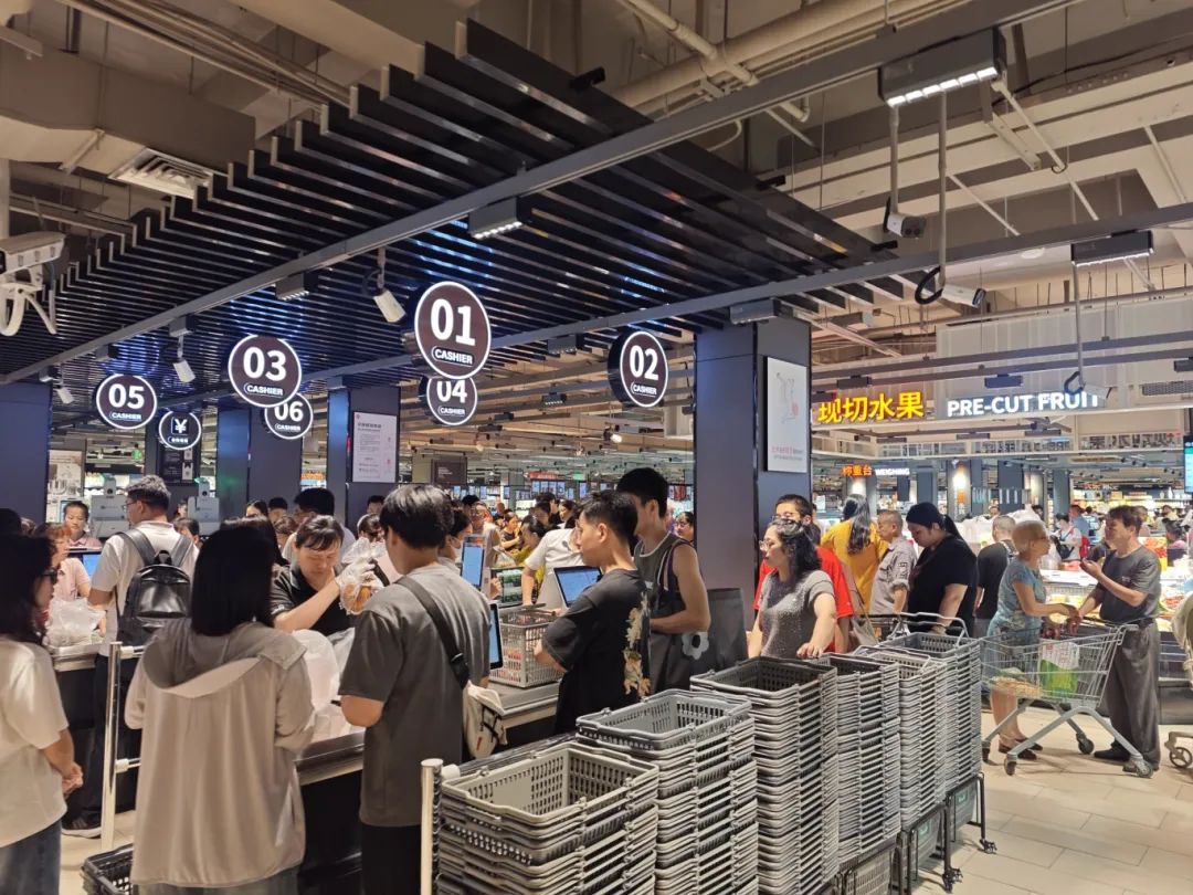5月23日,福州永辉超市群众路调改店恢复营业,众多市民前往体验。临近晚上十点现场依然人潮涌动,收银台大排长龙。