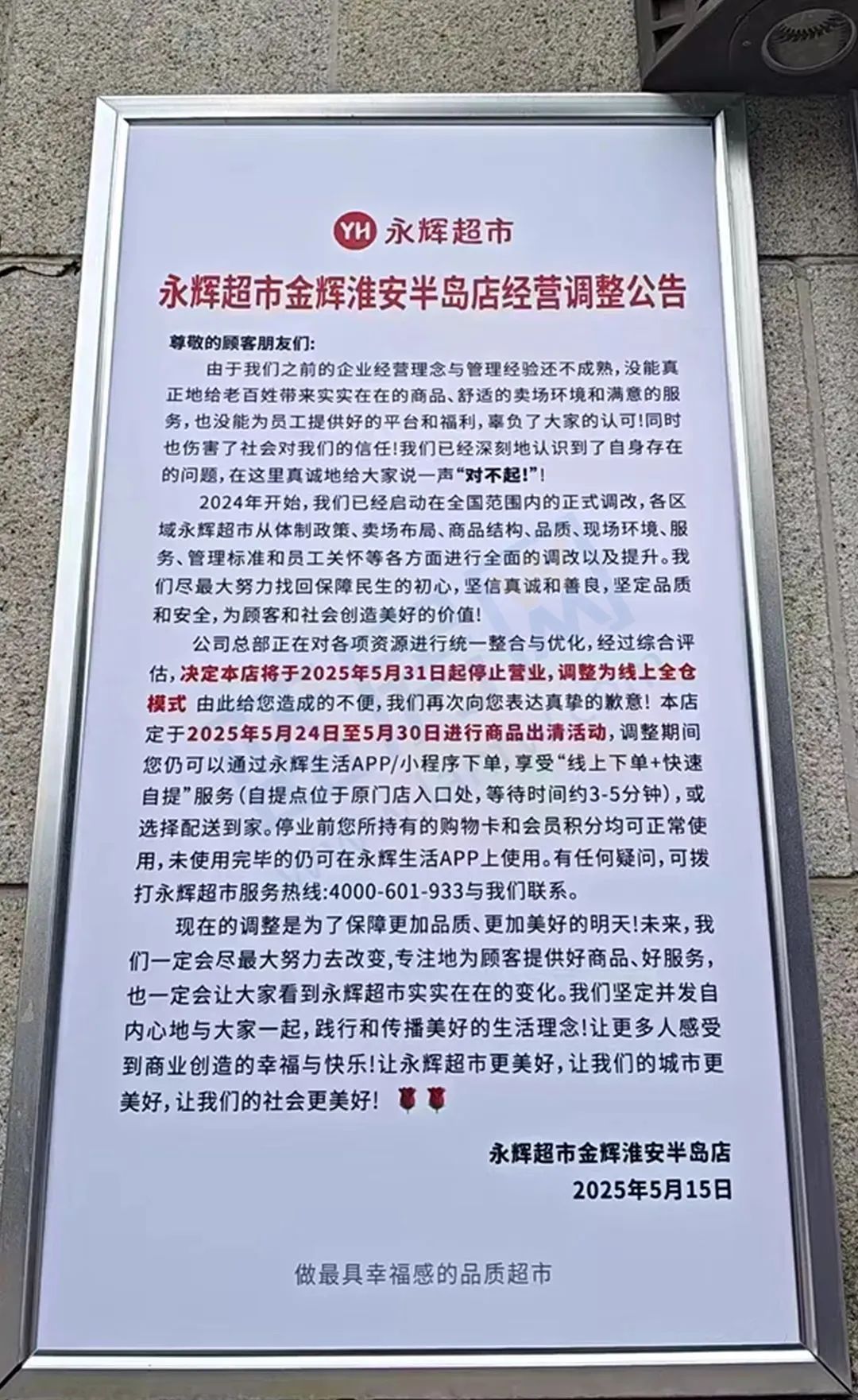 金辉淮安半岛店则表示将于2025年5月31日起停止营业,调整为线上全仓模式,定于2025年5月24日至5月30日进行商品出清活动。