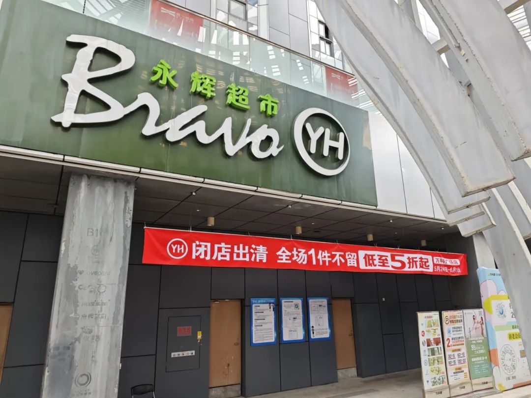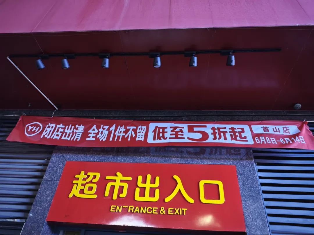 记者来到位于白马路的永辉超市万科广场店,看到超市店招下悬挂着一条写有“闭店出清,全场1件不留,低至5折起”的醒目条幅。