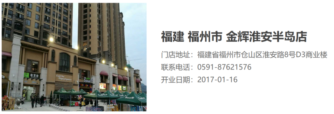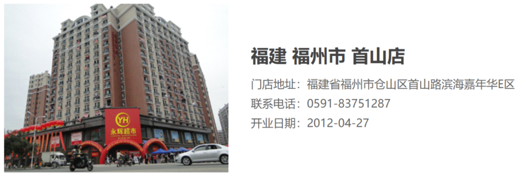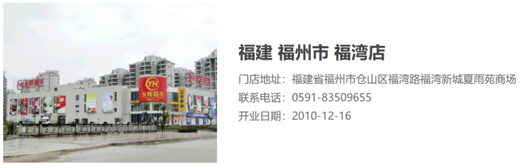官网显示,永辉超市福湾店于2010年12月16日开业。门店位于位于仓山区福湾新城夏雨苑商场,总营业面积超过10000平方米。