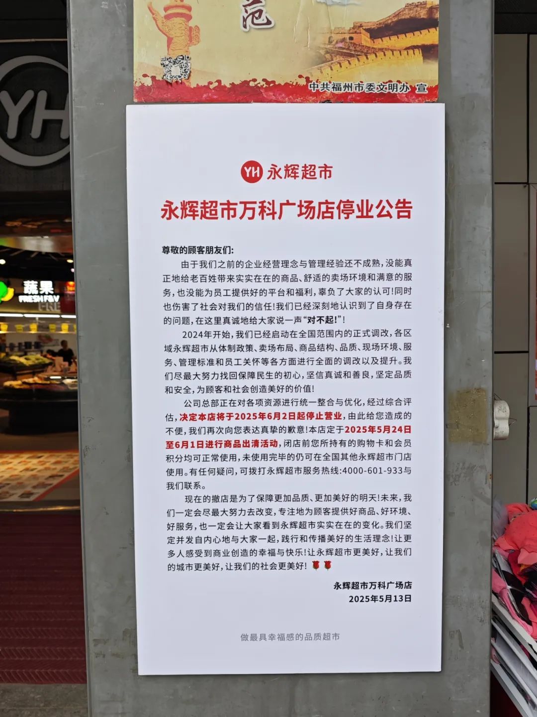 超市入口旁的柱子上,张贴着一张停业公告。公告表明,该店将于2025年6月2日起停止营业,定于2025年5月24日至6月1日进行商品出清活动。