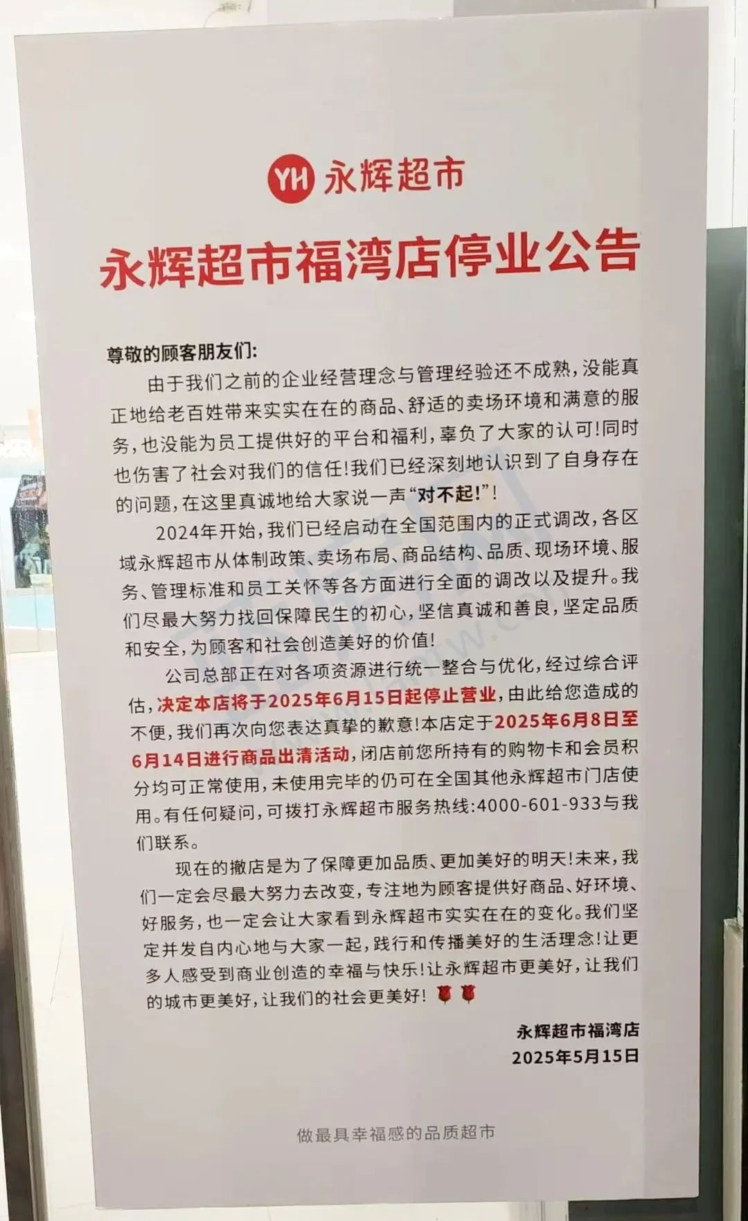 而在永辉超市福湾店的公告中,同样表示门店将于2025年6月15日起停止营业,定于2025年6月8日至6月14日进行商品出清活动。