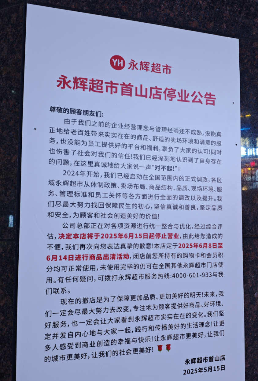 据一旁张贴的停业公告显示,首山店将于2025年6月15日起停止营业,定于2025年6月8日至6月14日进行商品出清活动。