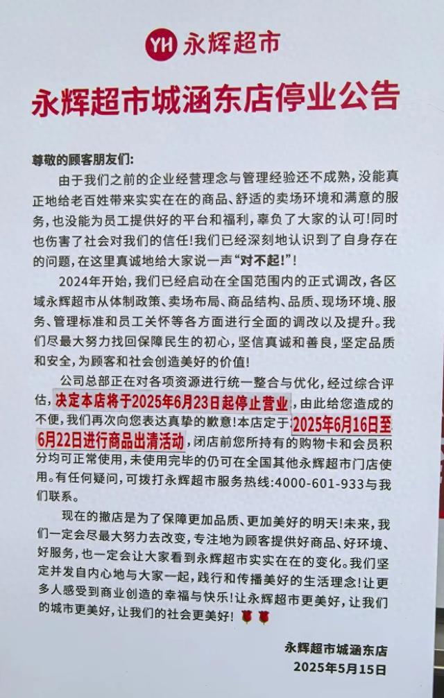 超市入口处的停业公告称:公司总部正在对各项资源进行统一整合与优化,经过综合评估,决定本店将于2025年6月23日起停止营业,6月16日至6月22日将进行商品出清活动。另外,市民所持有的购物卡和会员积分均可正常使用,未使用完毕的仍可在全国其他永辉超市门店使用。