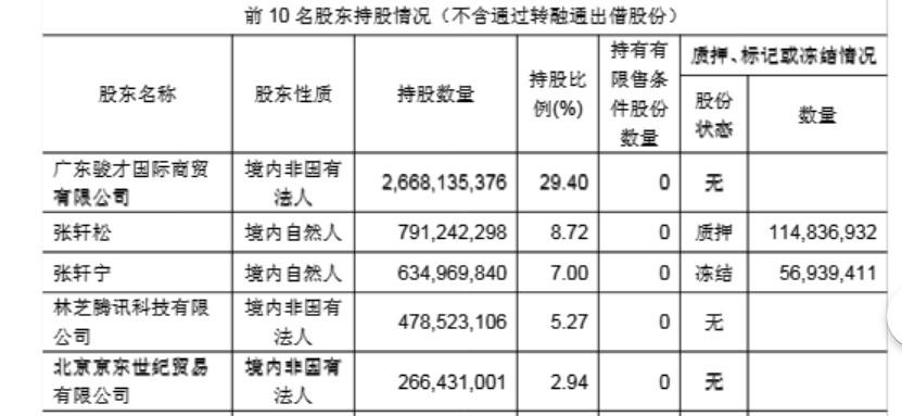 从永辉超市今年一季度披露的十大股东情况看,截至今年 3 月 31 日,京东世贸为永辉超市第五大股东,前四大股东分别为广东骏才国际商贸有限公司,持股 29.4%、张轩松持股 8.72%、张轩宁持股 7%、林芝腾讯科技有限公司持股 5.27%。