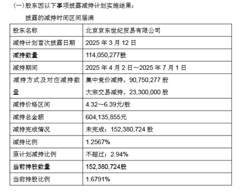 蓝鲸新闻 7 月 3 日讯(记者孙煜)7 月 2 日晚,永辉超市发布一则《股东减持股份结果公告》,其股东北京京东世纪贸易有限公司(以下简称:京东世贸)于 2025 年 4 月 2 日至 2025 年 7 月 1 日间合计减持 1.14 亿股,占公司目前总股本的 1.2567%。
