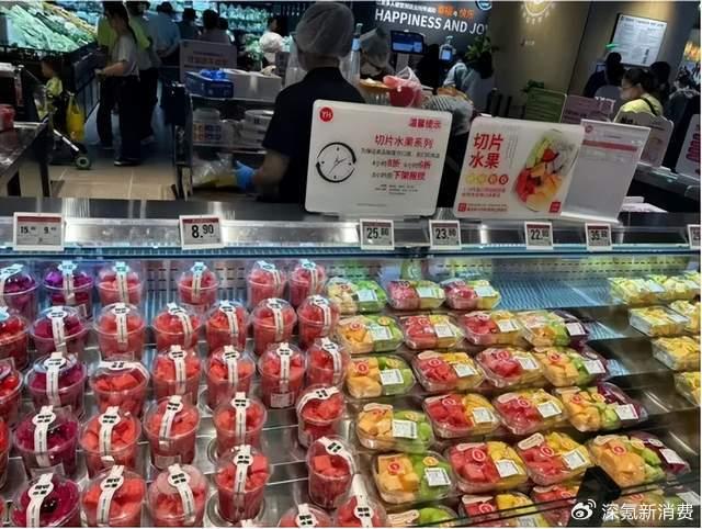 服务上更是处处“贴心”,在果切区、水果区、肉类区、冰冻区各处都能见到和胖东来如出一辙的人性化提醒——“果切4小时8折,6小时6折,8小时下架”,结账处不仅设有公平秤,还提供免费冰袋。
