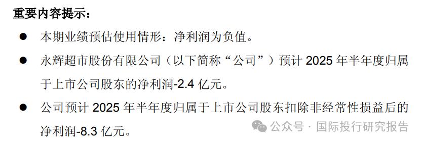 1、7月14日盘后,永辉超市披露了业绩预告,巨亏。根据这份预告,经财务部门初步测算,永辉超市预计2025年半年度实现归属于上市公司股东的净利润-2.4 亿元,与上年同期相比,将出现亏损。此外,公司预计 2025 年半年度实现归属于上市公司股东扣除非经常性损益后的净利润-8.3 亿元。