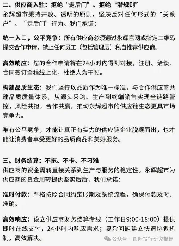供应链端,永辉也在下狠手。7月7日,永辉超市发布《致供应商伙伴的一封公开信》称,向腐败和潜规则宣战。其中提到,禁止任何员工(包括管理层)私自推荐供应商。
