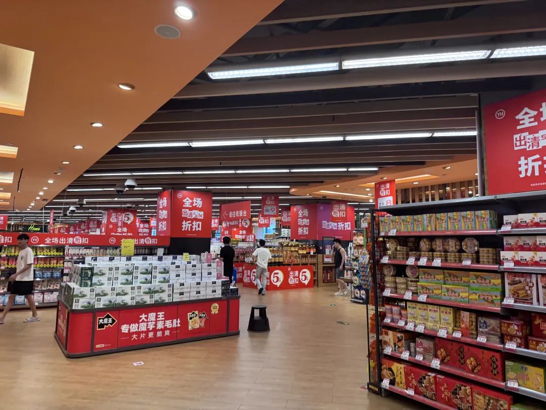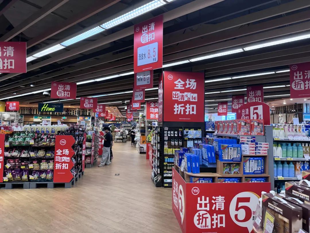 走进超市内,每一个货架前都是“出清折扣”海报,全场商品从5折到9折不等。