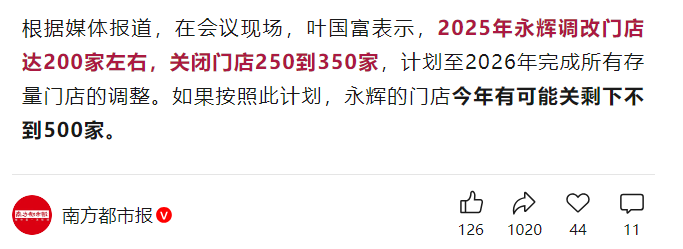 今年3月17日,南方都市报报道:名创优品创始人表示,2025年永辉调改门店达200家左右,关闭门店250到350家,计划至2026年完成所有存量门店的调整。