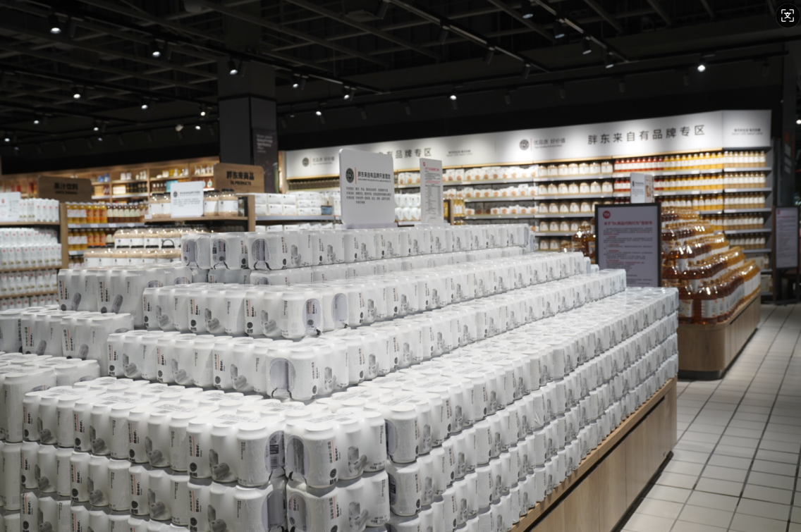 “这是福州永辉‘含胖量’最高的门店。”调改项目组负责人透露,门店专门设立了胖东来自有品牌专区,集中展示DL精酿啤酒、DL燕麦片、DL复合果汁、DL自由爱白酒等爆火单品。