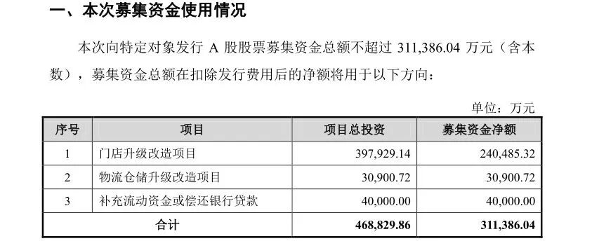 本次定增,募集资金当中有24.05亿元投向“门店升级改造项目”。本次拟升级改造的216家门店,于2024年累计实现营业收入198.47亿元,预计建设期满后,216家门店全部投入运营后的累计营业收入预计将达到328.17亿元,较2024年提升129.70亿元;本次拟升级改造的216家门店于2024年累计实现税前利润5.67亿元,升级改造建设期满后,216家门店累计税前利润预计将达到6.74亿元,较2024年提升1.07亿元。