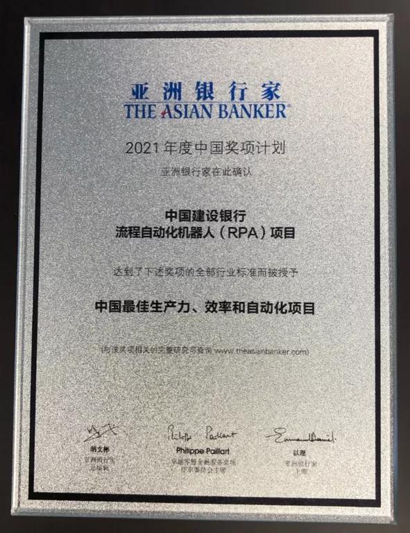 2021年7月22日,由国际权威财经杂志《亚洲银行家》主办的“2021年度中国颁奖典礼”在京举行,中国建设银行(以下简称“建行”)流程自动化机器人(RPA)项目荣获2021年度“中国最佳生产力、效率和自动化项目”。