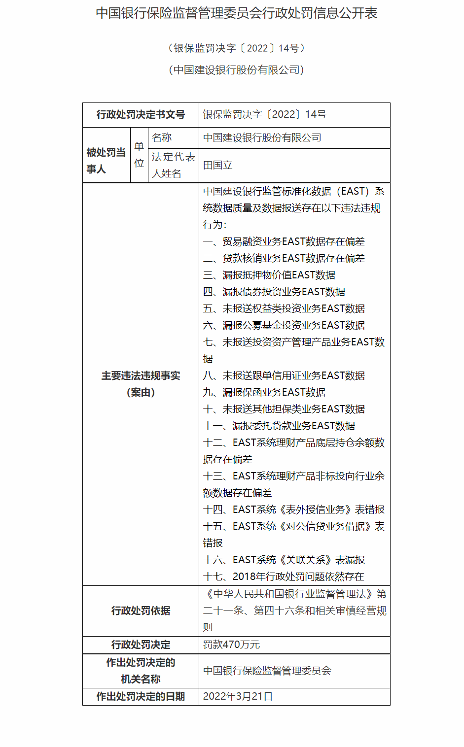3月25日下午,银保监会就“监管标准化数据(EAST)系统数据质量及数据报送违法违规行为”开出21张罚单,建设银行因监管标准化数据(EAST)系统数据质量及数据报送17项违法违规行为被罚款470万元。