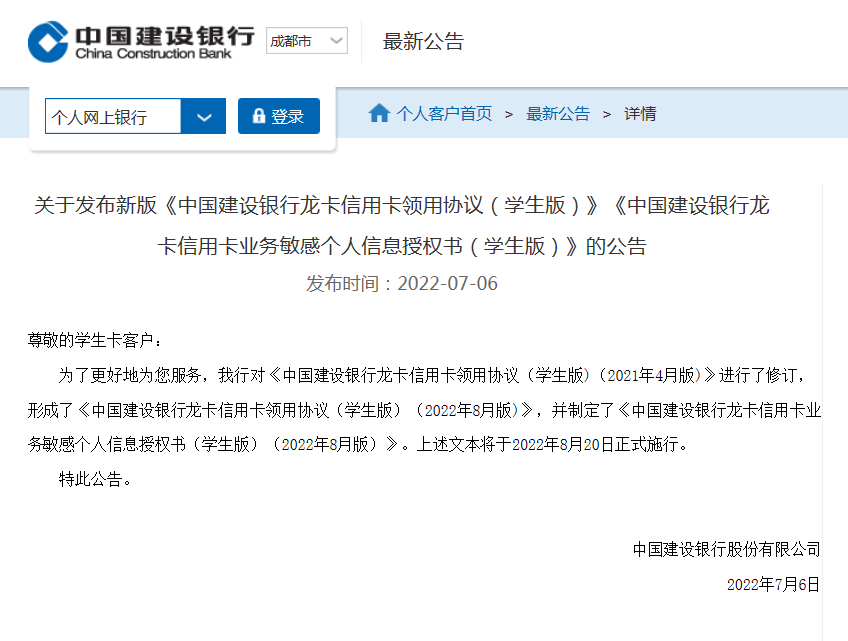 7月6日,中国建设银行发布了关于新版《中国建设银行龙卡信用卡领用协议(学生版)》《中国建设银行龙卡信用卡业务敏感个人信息授权书(学生版)》的公告。