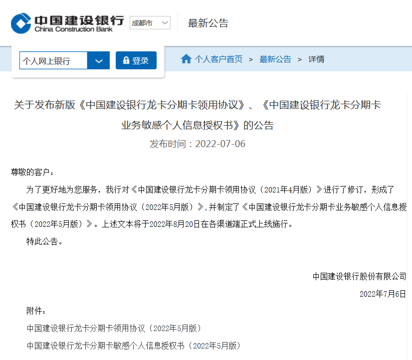 公告称:为了更好地服务,建行对《中国建设银行龙卡分期卡领用协议(2021年4月版)》进行了修订,形成了《中国建设银行龙卡分期卡领用协议(2022年5月版)》,并制定了《中国建设银行龙卡分期卡业务敏感个人信息授权书(2022年5月版)》。上述文本将于2022年8月20日在各渠道端正式上线施行。