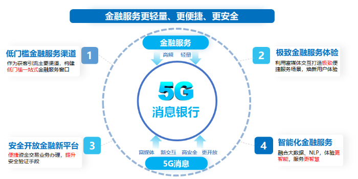 建设银行5G消息服务以“消息即服务”“消息即应用”的产品形态打破现有的线上产品交互模式,实现多渠道有效融合,可盘活银行现有App、H5应用资源,打造广覆盖、深触达、高可靠的5G消息连接。在银行侧,5G消息实现完整的商业流程,进而再次提升用户的粘性,提高营销触达转化率。在用户侧,5G消息让银行短信服务从能用向好用转变,切实增强人民群众对银行服务的获得感、安全感和幸福感。未来,依托银行自带支付结算能力,5G消息服务将成为建设银行轻量化一站式服务窗口,为用户提供数字化、智能化、随时随地、方便快捷的综合银行服务。