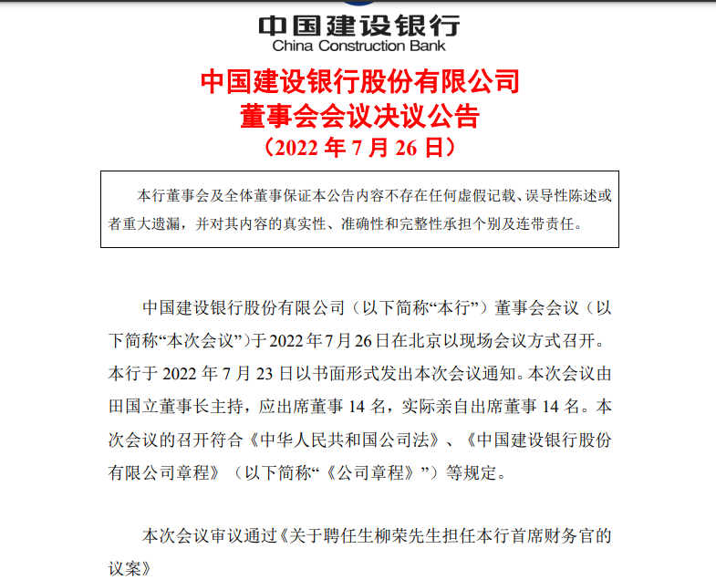 7月26日晚间,建设银行(SH601939,股价5.62元,市值14051亿元)发布董事会会议决议公告。