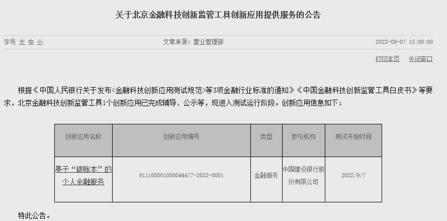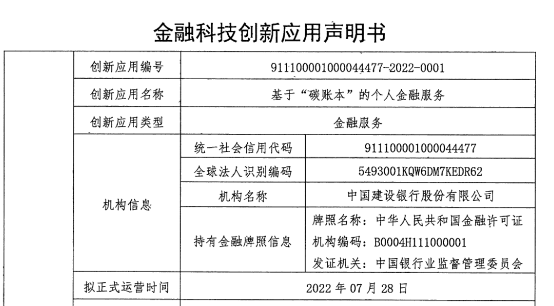 9月7日,建设银行发布《关于金融科技创新应用“基于‘碳账本’的个人金融服务”的公告》,称建设银行“基于‘碳账本’的个人金融服务”项目已完成登记,正式开始测试,测试期间需对项目《金融科技创新应用声明书》进行公告。
