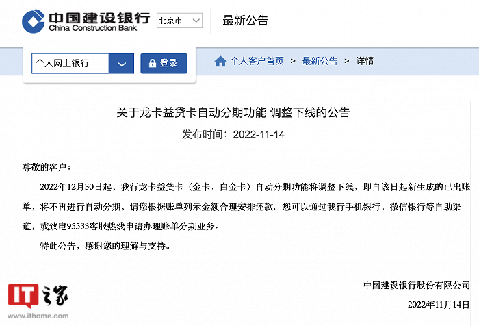 IT之家 11 月 14 日消息,中国建设银行发布公告称,2022 年 12 月 30 日起,该行龙卡益贷卡(金卡、白金卡)自动分期功能将调整下线,即自该日起新生成的已出账单,将不再进行自动分期,请您根据账单列示金额合理安排还款。
