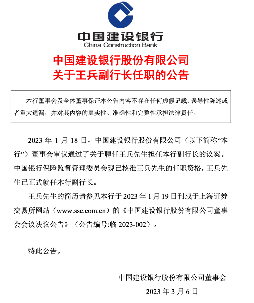 据建设银行最新公告,2023年1月18日,该行董事会审议通过了关于聘任王兵担任该行副行长的议案。银保监会现已核准王兵的任职资格,王兵已正式就任该行副行长。