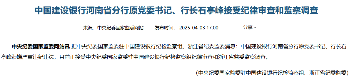 今年4月,中纪委国家监委网站发布消息,建行河南省分行原党委书记、行长石亭峰接受纪律审查和监察调查。