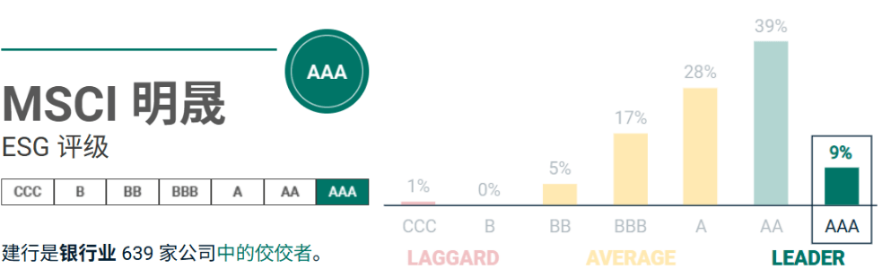 从外部评价看,建行ESG表现优异。国际评级方面,以MSCI(明晟)评级为例,建行获评AAA级,在纳入 MSCI 全球股票指数的639家银行中,位居第一梯队。