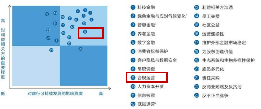 面对前述合规经营方面的挑战,尽管建行并未在 ESG 报告中有过多表述。目前,在建行2024年ESG工作实质性议题矩阵中,“合规经营”议题也并未进入核心位置。