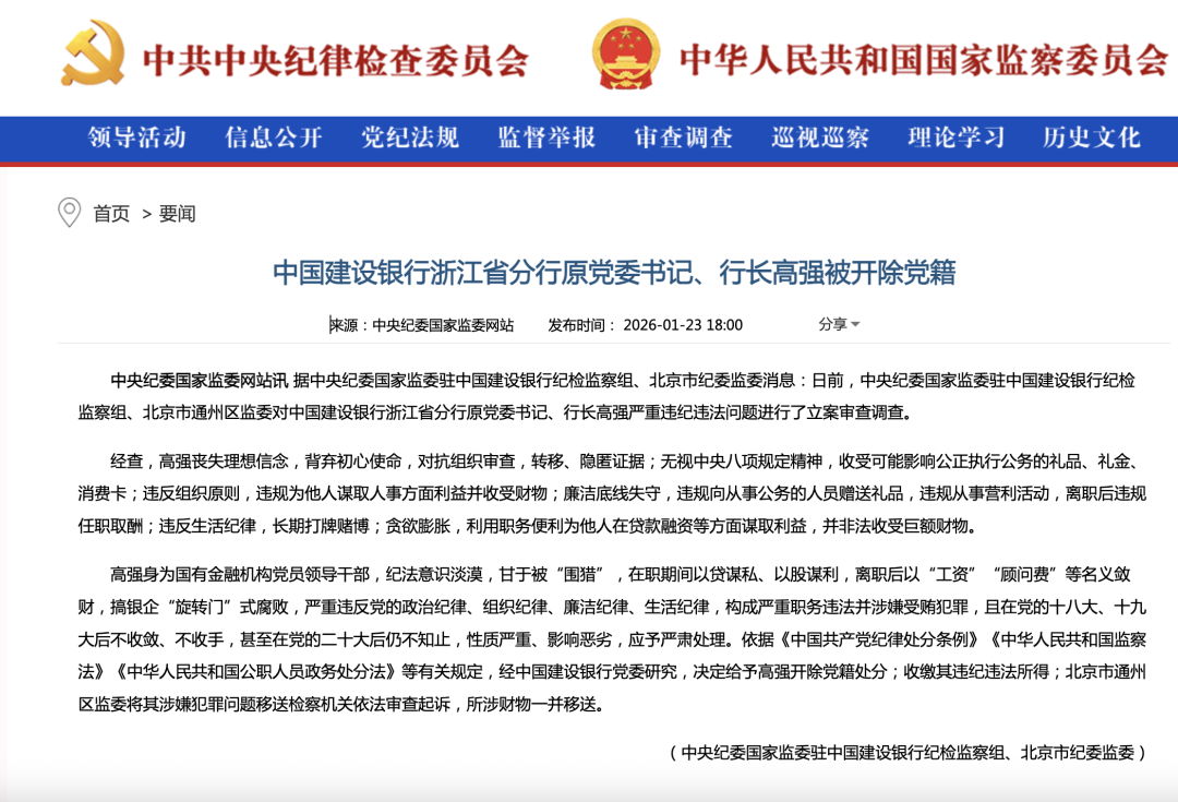 中国建设银行浙江省分行原党委书记、行长高强,已被开除党籍。经立案审查调查,高强丧失理想信念、背弃初心使命,存在多项严重违纪违法情形:对抗组织审查,转移、隐匿证据;无视中央八项规定精神,收受可能影响公正执行公务的礼品、礼金、消费卡;违反组织原则,违规为他人谋取人事利益并收受财物;廉洁底线失守,违规赠送礼品、从事营利活动,离职后违规任职取酬;违反生活纪律,长期打牌赌博;利用职务便利,在贷款融资等方面为他人谋利,非法收受巨额财物。
