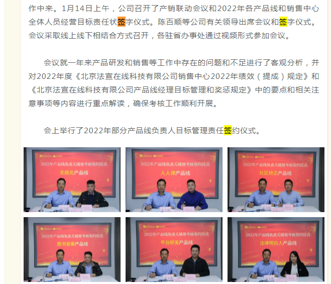 但在2021年,法宣在线公司未经审计净利润为458万元,同比减少约88%,且只有承诺净利润的11%。法宣在线公司公众号显示,为了动员全体员工的销售工作,2022年1月14日,销售中心全体人员还签订了新年经营目标责任状。